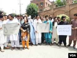 پشاور پریس کلب کے سامنے لگ بھگ دو گھنٹے احتجاج کرنے کے بعد مظاہرین جلوس کی شکل میں خیبر پختونخوا اسمبلی کے سامنے مظاہرہ کرنے کے لیے روانہ ہوئے ۔