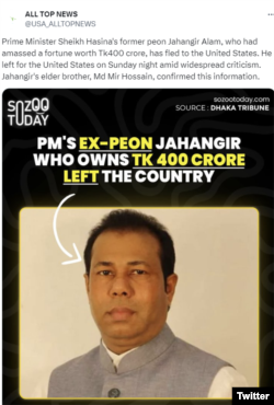 شیخ حسینہ واجد نے اگرچہ اپنے سابقہ ملازم کا نام نہیں لیا ہے لیکن بنگلہ دیش کے میڈیا کی رپورٹس کے مطابق وزیرِ اعظم جہانگیر عالم کا تذکرہ کر رہی ہیں۔