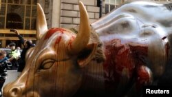 امریکہ کے شہر نیو یارک میں مظاہرین نے وال اسٹریٹ پر لگے بیل کے مجسمے اور اپنے کپڑوں کو جعلی خون سے رنگ دیا اور پھر سڑکوں پر لیٹ کر انوکھا مظاہرہ کیا۔
