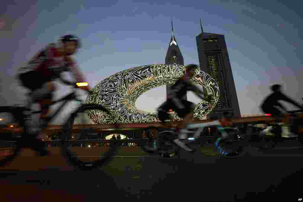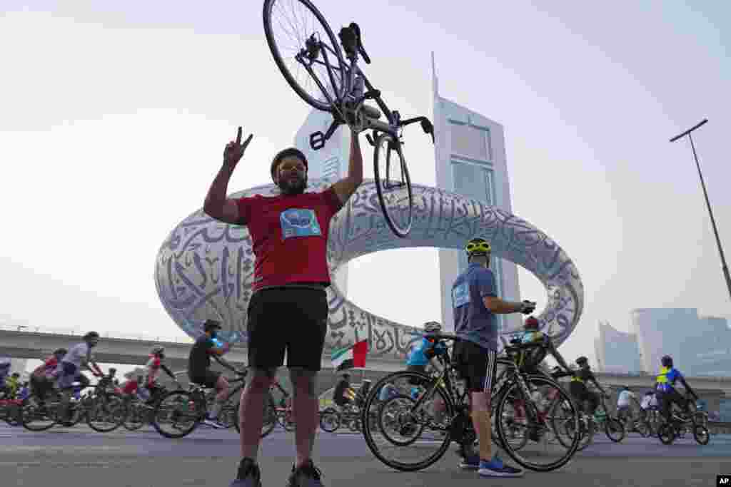 متحدہ عرب امارات (یو اے ای) کے شہر دبئی میں اتوار کی صبح سورج نکلنے سے قبل مرکزی شاہراہ شیخ زید روڈ پر گاڑیاں روک کر ہزاروں سائیکل سواروں کو راستہ دیا گیا۔ ہر سال ہونے والی یہ سائیکل ریس 10 لائنوں والی شاہراہ پر ہوئی، جہاں سے دنیا کی بلند ترین عمارتوں کو دیکھا جا سکتا ہے۔ ان میں برج خلیفہ اور مستقبل کا میوزیم شامل ہیں۔ ریس میں شریک سائیکل سواروں نے سورج نکلنے پر تصویروں کے لیے پوز بنوائے اور ہائی وے پر سائیکلیں دوڑائیں۔