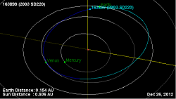 ارتھ اسکائی کی خبر کے مطابق امریکی خلائی ادارے ناسا کا کہنا ہے کہ 163899 یا 2003 ایس ڈی 220 نامی سیارچہ 24 دسمبر کو زمین کے قریب آئے گا اور ایک محفوظ فاصلے سے گزر جائے گا۔
