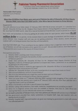 ایسی صورتِ حال میں پاکستان ینگ فارماسسٹ ایسوسی ایشن کی طرف سے ایک بیان جاری کیا گیا جس میں الزام عائد کیا گیا کہ 30 جنوری کو حکومت کی طرف سے فیس ماسک کی برآمد پر سخت پابندی عائد کر دی گئی تھی۔ لیکن 7 فروری کو ڈپٹی ڈائریکٹر ڈریپ غضنفر علی خان، سی ای او ڈریپ عاصم رؤف اور معاون خصوصی برائے صحت ڈاکٹر ظفر مرزا کی ملی بھگت سے دو کروڑ ماسک چین بھجوانے کے چھ پرمٹ جاری کیے گئے۔