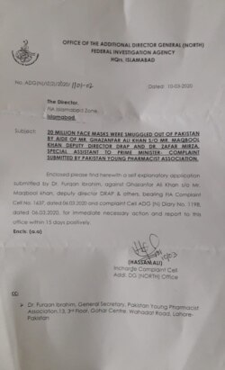 ینگ فارمسسٹ ایسوسی ایشن نے ماسک کی برآمدگی کا الزام معاونِ خصوصی برائے صحت ڈاکٹر ظفر مرزا اور ڈرگ ریگولیٹری اتھارٹی (ڈریپ) کے عہدے داران پر عائد کیا ہے۔