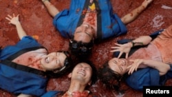 اس سے پہلے کہ آپ کا تخیل آپ کو ڈراؤنی فلموں کی زندہ لاشوں، خون کے تالابوں اور قتل و غارت کے مناظر کی جانب لے جائے آپ کو بتادوں کہ یہ تصویر ایک منچلے کی ہے جو ٹماٹروں کے رس اور گودے میں لوٹنے کے مزے لے رہا ہےاور وہ ان ہزاروں تماشائیوں میں سے ایک ہے جو اسپین کے اس تہوار میں حصہ لینے کے لیے دور دور سے آتے ہیں۔