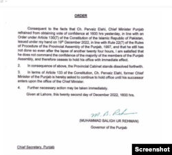 گورنر نے اپنے حکم نامے میں جہاں پنجاب کی کابینہ کے تحلیل کرنے کا حکم جاری کیا، وہیں اگلے وزیراعلیٰ کے عہدہ سنبھالنے تک پرویزالہیٰ کو ہی وزارتِ اعلیٰ کے منصب پر رہنے کی ہدایت کی۔
