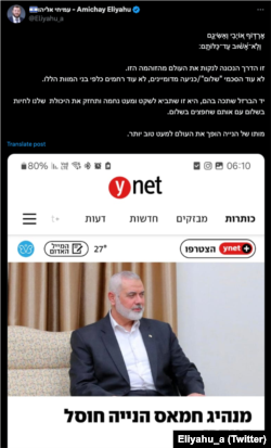اسرائیلی وزیرِ اعظم بن یامین نیتن یاہو کی کابینہ میں شامل وزیرِ ثقافت عمیحائی اِلیاہو نے سوشل میڈیا پر عبرانی زبان میں ایک بیان میں کہا ہے کہ دنیا کو گندگی سے پاک کرنے کا یہی درست طریقہ ہے۔ مزید کوئی ’امن‘ یا ہتھیار ڈالنے کے معاہدے نہیں ہوں گے۔