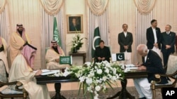 وزیر اعظم ہاؤس پہنچنے کے بعد ایک خصوصی تقریب میں دونوں ملکوں کے وزرا اور اعلیٰ اہلکاروں نے متعدد شعبوں میں دو طرفہ تعلقات کو آگے بڑھانے کیلئے مفاہمت کی یادداشتوں پر دستخط کئے۔ اس موقع پر سعودی ولی عہد اور پاکستانی وزیر اعظم بھی موجود تھے۔