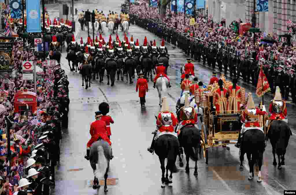 برطانیہ کے بادشاہ چارلس سوم کی تاج پوشی کردی گئی ہے۔ ہفتے کا دن برطانیہ کے شاہی خاندان کے لیے اہمیت کا حامل تھا کیوں کہ 70 برس بعد تاج پوشی کی یہ پہلی تقریب تھی۔ لندن کے ویسٹ منسٹر ایبی میں شاہ چارلس کو ہیروں اور قیمتی پھتروں سے جڑا ہار پہنایا گیا جس کے بعد ان کی اہلیہ کو بھی تاج پہنایا گیا جس کے بعد انہیں ملکہ کا خطاب مل گیا ہے۔ تاج پوشی کی تقریب کے بعد بادشاہ اور ملکہ شاہی بگھی میں سوار ہوکر بکنگھم پیلس گئے جہاں انہوں نے اپنے چاہنے والوں کو ہاتھ ہلا کر جواب دیا۔ اس دوران فلائی پاسٹ کا بھی مظاہرہ کیا گیا۔ تاج پوشی کی تصویری جھلکیاں دیکھیے اس پکچر گیلری میں۔
