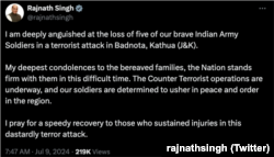 بھارت کے وزیرِ دفاع راج ناتھ سنگھ نے کٹھوعہ میں عسکریت پسندوں کے حملے پر اپنی گہری تشویش کا اظہار کیا ہے۔
