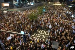 اسرائیلی دارالحکومت تل ابیب میں ہفتے کو ہونے والے احتجاج میں ہزاروں مظاہرین شریک ہوئے جو پچھلے سال سات اکتوبر کو حماس کے جنوبی اسرائیل پر کیے جانے والے حملے کے 400 دن گزرنے سے متعلق پوسٹرز تھامے احتجاج کر رہے تھے۔