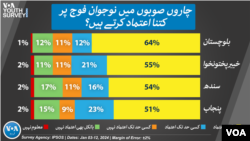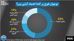 وائس آف امریکہ کے سروے میں پاکستان کے نوجوانوں کی اکثریت نے فوج پر اعتماد کا اظہار کیا ہے جب کہ ملک کے 15 فی صد نوجوان ایسے ہیں جن کا کہنا ہے کہ وہ فوج پر بالکل بھی اعتماد نہیں کرتے۔