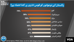 وائس آف امریکہ نے یہ سروے بین الاقوامی ادارے اپسوس کے ذریعے کرایا ہے جس میں 18 سے 34 برس کے نوجوانوں سے یہ سوال بھی کیا گیا تھا کہ انہیں کس قومی ادارے پر کتنا اعتماد ہے۔