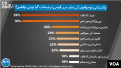 سروے میں 18 سے 34 برس کے نوجوانوں سے یہ سوال بھی کیا گیا تھا کہ اُن کے خیال میں پاکستان کی پہلی قومی ترجیح کیا ہونی چاہیے۔