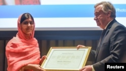 پیر کو اقوام متحدہ کے صدر دفتر میں منعقدہ تقریب میں سیکرٹری جنرل انتونیو گوئتریس نے 19 سالہ پاکستانی طالبہ کو خوش آمدید کہتے ہوئے کہا کہ "میں ایک مضطرب طبیعات کا سابق پروفیسر ہوں۔۔۔ اور دنیا کی معروف طالبہ کا سامنا کر رہا ہے۔ آپ ایک ہیرو ہیں، لیکن آپ ایک بہت پرعزم اور شفیق انسان ہیں۔"