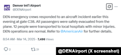امریکہ کے فضائی امور کے نگراں ادارے فیڈرل ایوی ایشن ایڈمنسٹریشن (ایف اے اے) نے ایک بیان میں کہا ہے کہ مسافر طیارہ کولوراڈو کے اسپرنگ ایئرپورٹ سے ڈیلس فورٹ ورتھ جا رہا تھا کہ عملے نے انجن میں تھرتھراہٹ رپورٹ کی جس کے بعد طیارے کو ڈینور ایئرپورٹ موڑ دیا گیا۔