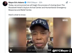 نیویارک سٹی کے میئر ایرک ایڈمز نے پیر کو سوشل میڈیا پلیٹ فارم 'ایکس' پر ایک پوسٹ میں کہا کہ آج ہم اعلان کرتے ہیں کہ ہم "روز ویلٹ ہوٹل میں مہاجرین کی پناہ گاہ اور ہیومنیٹرین ریسپانس اینڈ ریلیف سینٹر بند "کرنےکا عمل شروع کریں گے۔