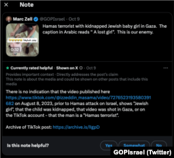 مرک زیل نے ویڈیو کے ساتھ تحریر میں لکھا ہے کہ حماس کے دہشت گرد ایک یہودی بچی کو اغوا کرکے غزہ لے گئے ہیں۔