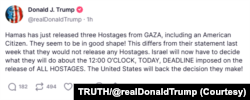 صدر ٹرمپ نے ہفتے کو سماجی رابطے کی سائٹ' ٹروتھ سوشل' پر ایک بیان میں کہا ہے کہ حماس نے صرف تین یرغمالوں کو رہا کیا ہے جن میں ایک امریکی شہری بھی شامل ہے اور وہ تمام ٹھیک حالت میں نظر آ رہے ہیں۔