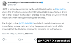 دوسری جانب ہیومن رائٹس کمیشن آف پاکستان (ایچ آر سی پی) نے سرگودھا کی صورتِ حال پر تشویش کا اظہار کرتے ہوئے کہا ہے کہ گل والا گاؤں کی مسیحی کمیونٹی کی جانوں کو مبینہ طور پر خطرہ ہے جہاں ہجوم مشتعل ہے۔