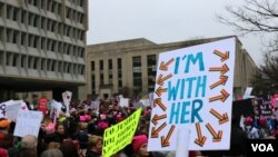 ہزاروں خواتین مظاہروں کے لیےواشنگٹن کی معروف شاہراہ انڈی پینڈنس ایونیو پر جمع ہوئیں۔ ایک روز پہلے اس مقام سے کچھ فاصلے پر صدر ڈونلڈ ٹرمپ نے اپنے عہدے کا حلف اٹھایا تھا۔